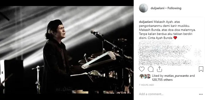 "Makasih Ayah, atas pengorbananmu demi karir musikku. Makasih Bunda, atas doa-doa malamnya. Tanpa kalian berdua aku takkan berdiri disini. Cinta Ayah Bunda," tulis Dul Jaelani.